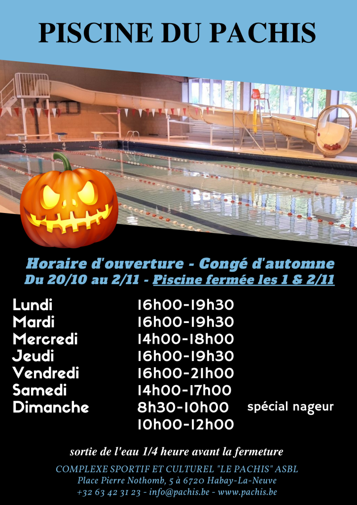 🎃 Voici nos horaires d’ouverture de la piscine durant la période des vacances d’automne.