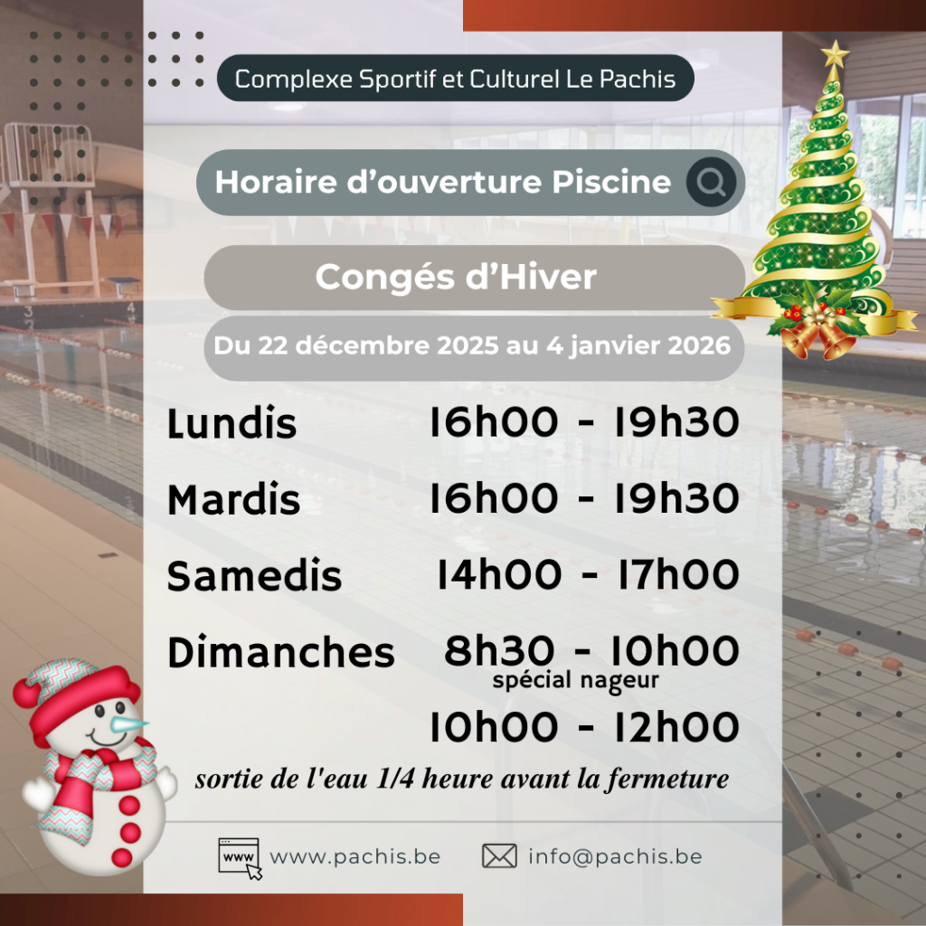 Voici nos horaires d’ouverture de la piscine durant la période des vacances d’hiver.