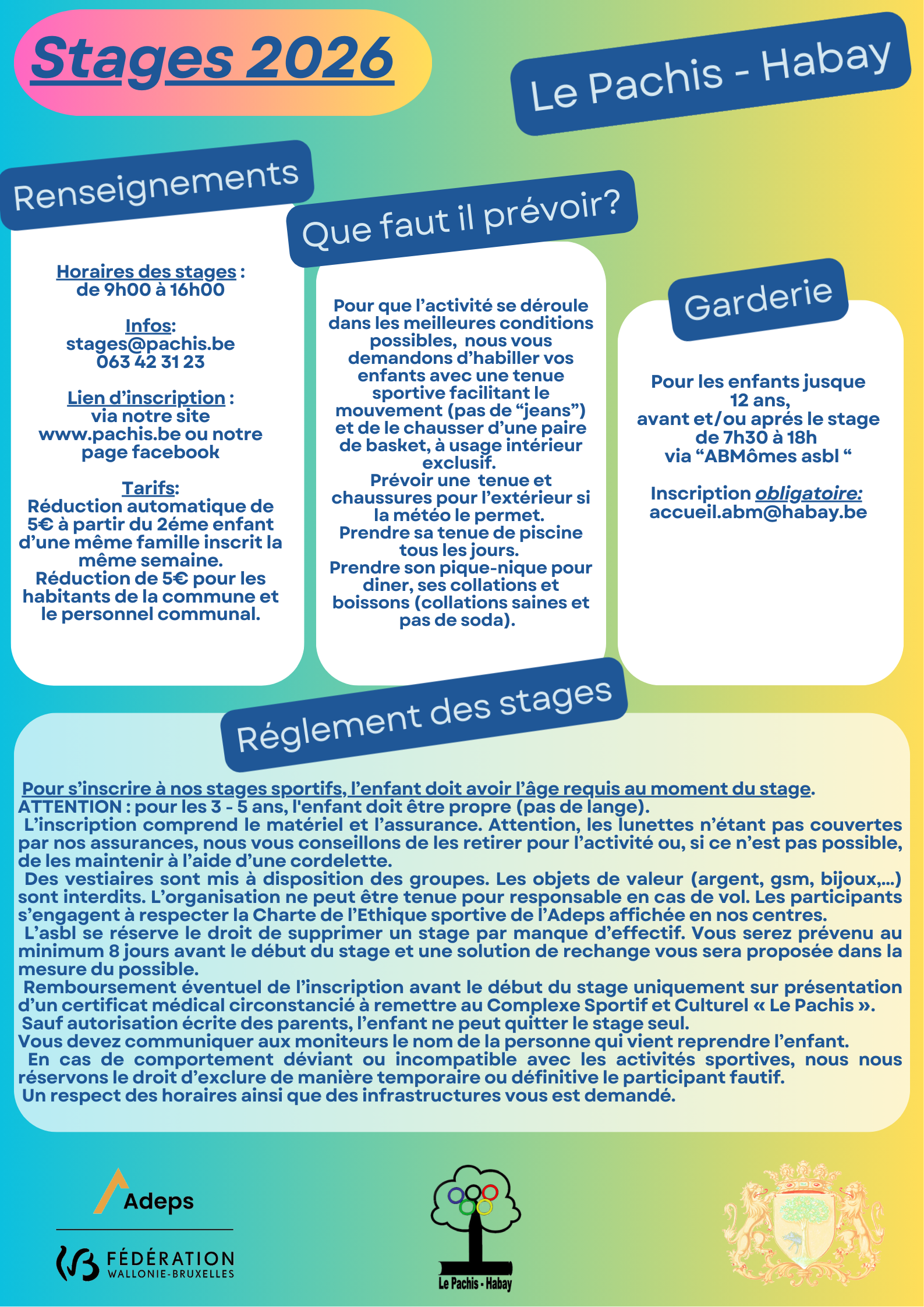 Nos Stages PROGRAMME STAGES DETENTE 2026 Du 23 au 27 février.De 3 à 12 ans.Inscriptions à partir du 13 janvier à 19h. Programme Inscriptions Infos Consentement RGPD Semaine 1 Inscriptions Semaine 2 Inscriptions Semaine 3 Inscriptions Semaine 4 Inscriptions Semaine 5 Inscriptions Semaine 6 Inscriptions Journée AdosMultiWex Inscriptions Journée AdosEuroSpace Center Inscriptions Stage AdultesSemaine 3 Inscriptions Semaine 4 Inscriptions Semaine 5 Inscriptions Natation Cours EnfantsAccoutumance et apprentissage Plus d’info Aquadultes Cours pour adultes n’étant pas à l’aise dans le milieu aquatique Plus d’info Aquagym Cours d’Aquagym dynamique pour tout public Plus d’info Psychomotricité Cours de psychomotricité sportive générale.Pour les 3 – 5 ans. Plus d’info Fitness Sessions de renforcement musculaire.Cours adaptés à tous. Plus d’info Course à pied Sessions de Je Cours Pour Ma Forme.Plusieurs niveaux proposés. Plus d’info Marche Nordique Sessions d’initiation à la marche nordique.Technique ALFA. Plus d’info Retour Pour nous contacter Complexe Sportif et Culturel « Le Pachis » Place Pierre Nothomb, 56720 Habay-La-Neuve, Belgique +32 63 42 31 23 info@pachis.be Retrouvez nous sur les réseaux Facebook